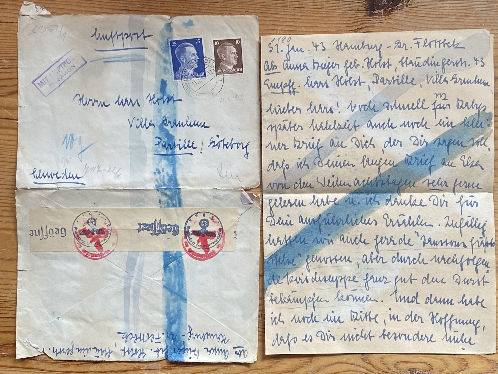 Breven från Tyskland till Sverige 1943 var ordentligt kontrollerade - stämplar, censurremsor och ofta också kontrollerade för ev. osynlig skrift...kunde se ut så här...
