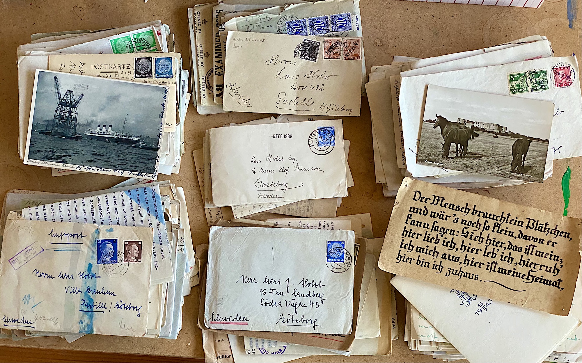 Brev med och utan innehåll, svenskt och tyskt frankerade. Många adresserade till Lars Holst, Markus far. Som bodde i Sverige under och efter andra världskriget.