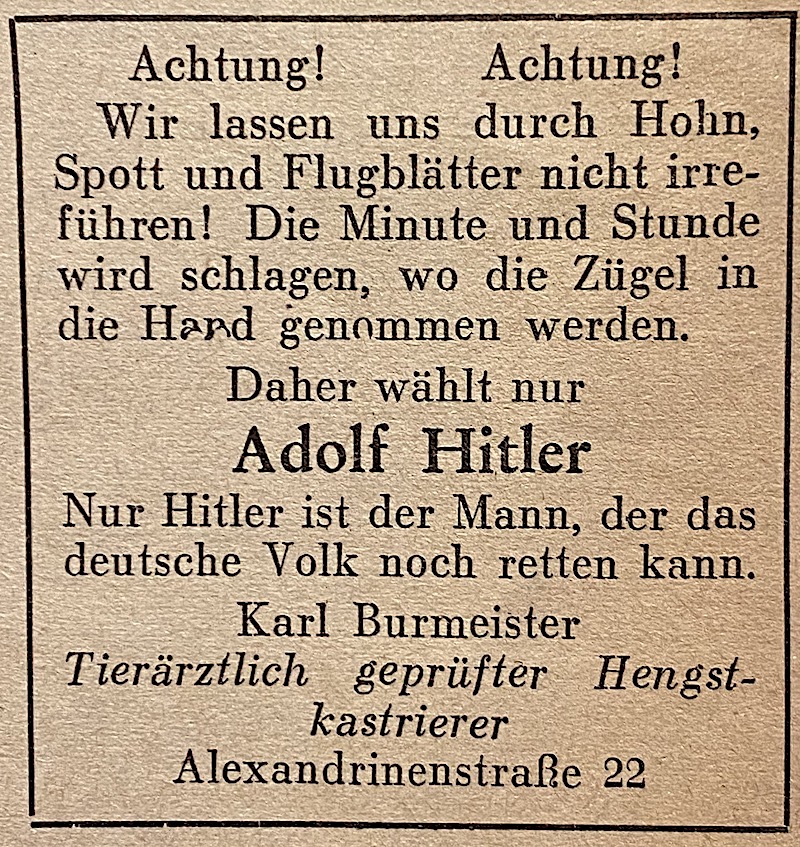 Nej, en till, den är för bra! En "annons" från 1932 i Rostocker Anzeiger