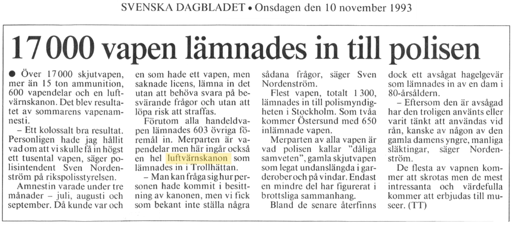 Jag har fått för mig att det lämnats in en 20mm LV kanon under vapenamnestin 1993. Det har stått om detta i flera tidningar så är det verkligen en skröna?