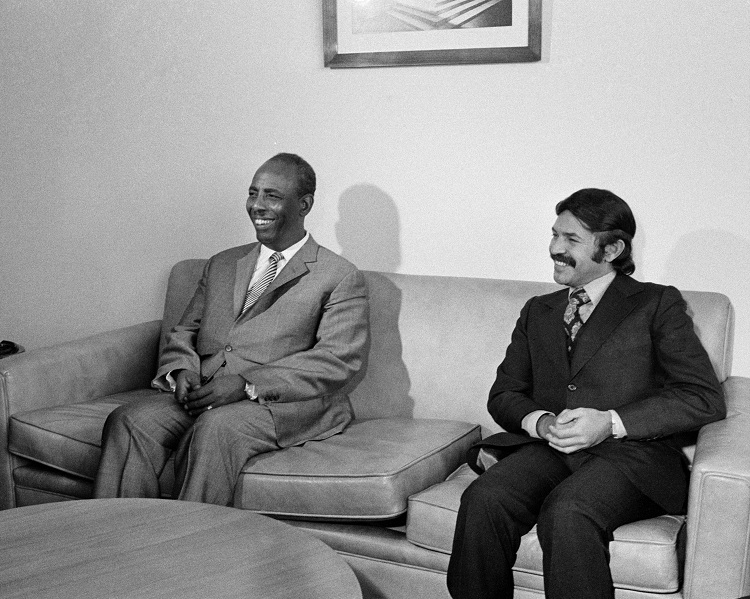 "The President of the Supreme Revolutionary Council of the Somali Democratic Republic, Major General Mohamed Siad Barre, paid an official visit to United Nations Headquarters on 8 October and attended a dinner given in his honour by Secretary-General Kurt Waldheim. On 9 October he made an address to the General Assembly. General Barre (left) is seen during his meeting with Abdelaziz Bouteflika (Algeria), President of the General Assembly."
