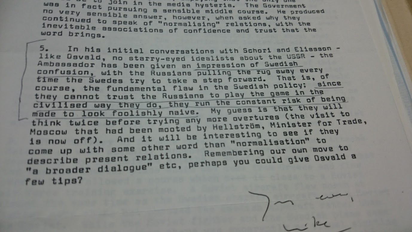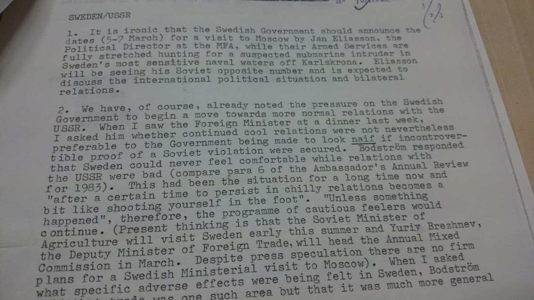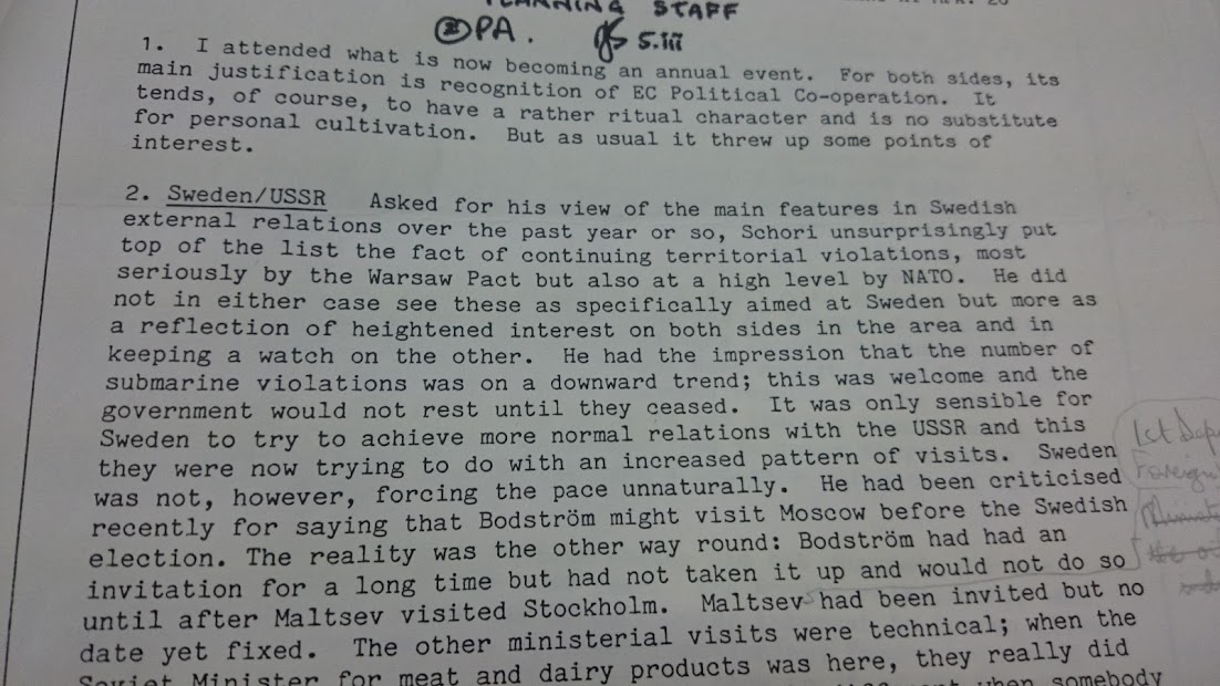 Det är väl inget nytt att Schori aldrig accepterat bilden att Ubåtarna kom från Sovjet utan att han hela tiden pushat för den alternativa bilden att Ubåtarna kom från Väst? Dokumentet visar på ett utmärkt sätt hur Ubåtskränkningarna "ligger i vägen" för regeringen Palme,.. Palmes regering kan inte skapa de nära relationer med Sovjet som de önskar eftersom de återkommande Ubåtskränkningarna hela tiden stör o påverkar diplomatin.