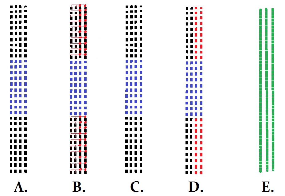 Här är en till bild med lite mer grafik för att förenkla. Nu är motståndarna istället lika många. Jag vet inte hur ofta arméer sköt med tredje ledet över axeln på de två främre, dock vet jag att ett fjärde led nästan aldrig sköt över de tre främre. Om man nu endast sköt med de två främre och använde det sista som "reserv" så skulle svenskarna kunna skjuta lika många skott som sina motståndare, utöver att svenskarna också marscherade i lösare formation kanske de heller inte fångade upp lika många kulor.