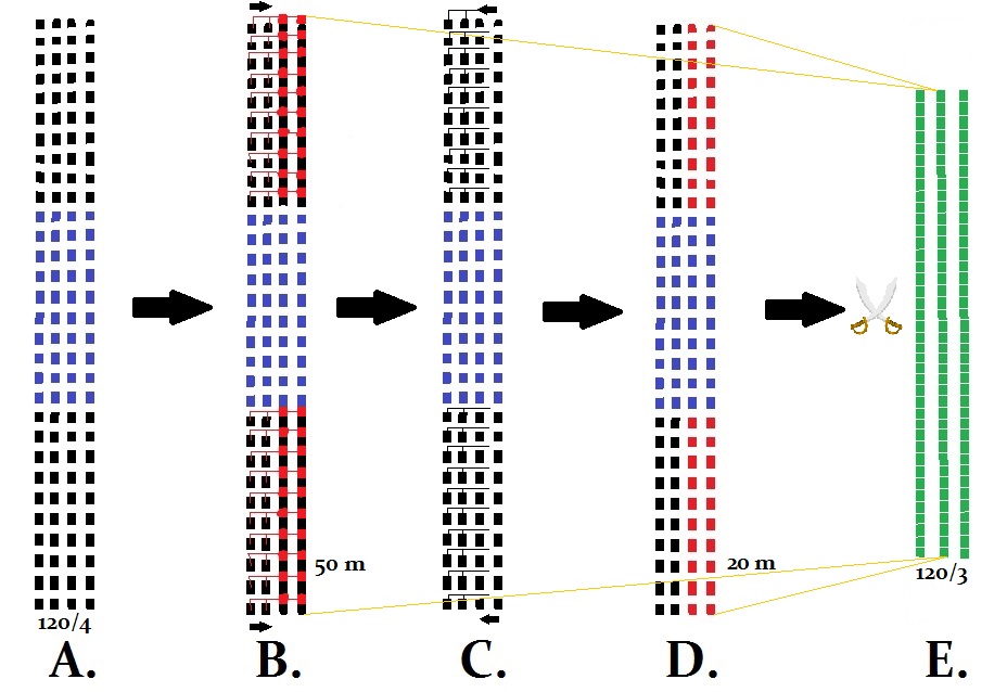 E. De går sedan in i anfall med blanka vapen mot motståndaren (grön).