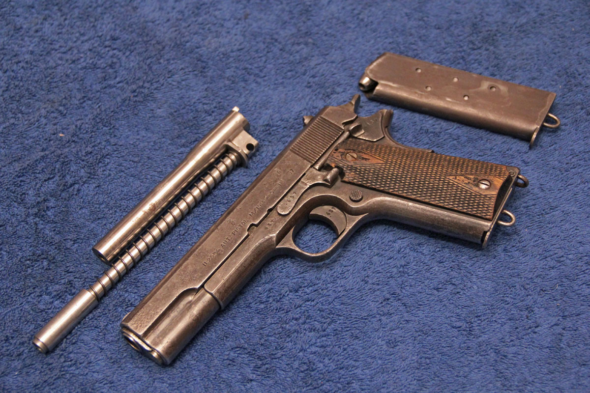 Det är närbild på mantelspåren på Kongsberg Colt, den norska kopian av Colt 1911 pistolen.