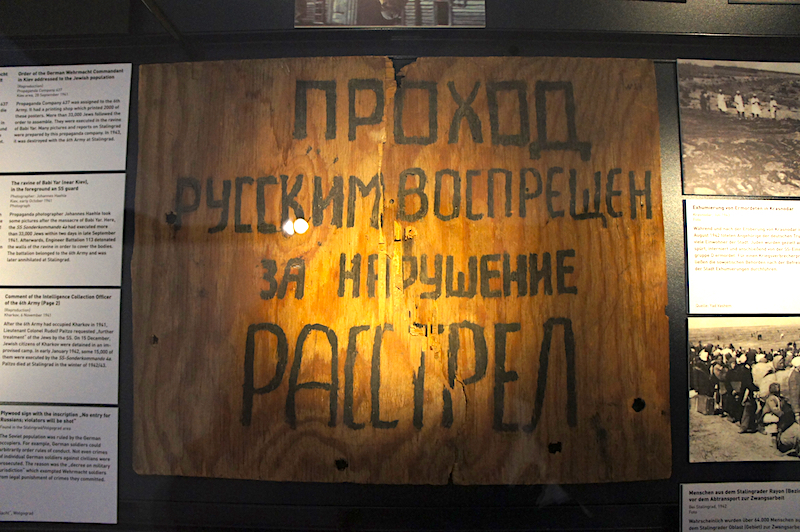 Plywood-skylt från Stalingrad: "Förbjuden passage för ryssar, vid överträdelse arkebusering"...