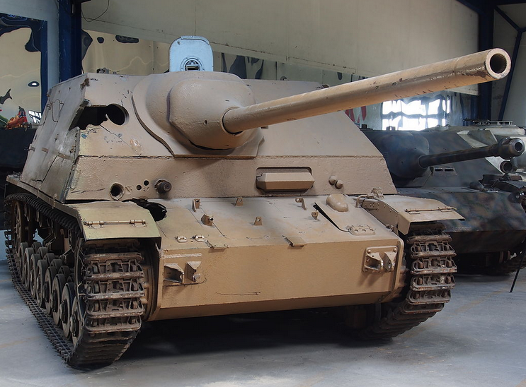 Vagnen saknar mynningsbroms. Vem som först började med mynningsbromsar vet jag inte men både tyskar och britter var tidigt ute. Ifråga om Jagdpanzer IV klagades det över att då den var låg så kastade mynningsbromsen upp både snö och skräp, beroende årstid. Nästa skott hade då sämre chans att träffa.