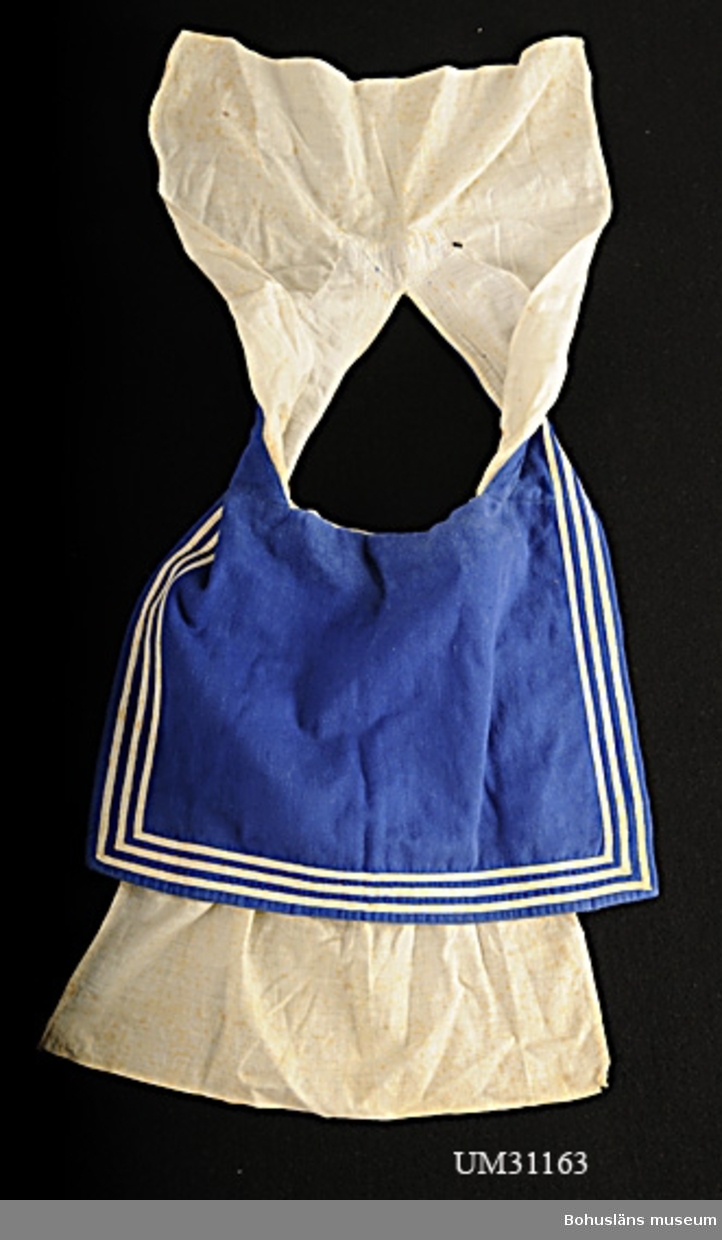 Under på överkroppen en långärmad vit skjorta - med blåkrage som lades ut - utanför blusen på bussarongen.