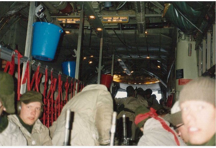 Vi steg på bussarna vid järnvägsstationen, iklädda civila kläder. När vi anlände efter en halvtimmes bussresa till mobförrådet var det urstigning. I förrådet fanns ALLT! Vi tilldelades utrustning (av praktiska skäl vår egen personliga som vi på förhand lämnat i svarta säckar med namn/nummer på). Där fanns granatkastare, motorcyklar, kokvagn, fältbageri osv osv. Det vi INTE tog med oss var tyngre vapen (av säkerhetsskäl på förhand lastat i bandvagnarna hemma på regementet: ksp58, P-skott markeringsvapen, närlys, AM-kollin till GRK etc). Efter omklädning och civil stass tillbaka i påsen blev det in i bussen och till F4 där vi ilastade Hercules fvb Gällivare. Allt klaffade perfekt. All personlig utrustning bockades av. Fältpostbrev utdelades.