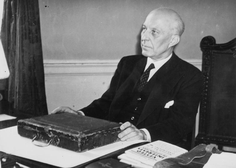 Bilden på Dalton är väl från hans tid som Chancellor of the Exchequer under Attlee 1945, vad är det för bok han har bredvid budgetväskan? Titeln ser ut att vara "Vested Interests".