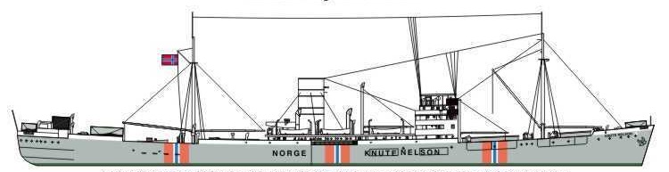 Vårt andra skepp – är det norska rederiet Fred Olsen & Co’s m/s KNUTE NELSON – ett modernt motorfartyg om 5750 ton. Hon ligger till ankars i den lite isolerade Südepiepviken