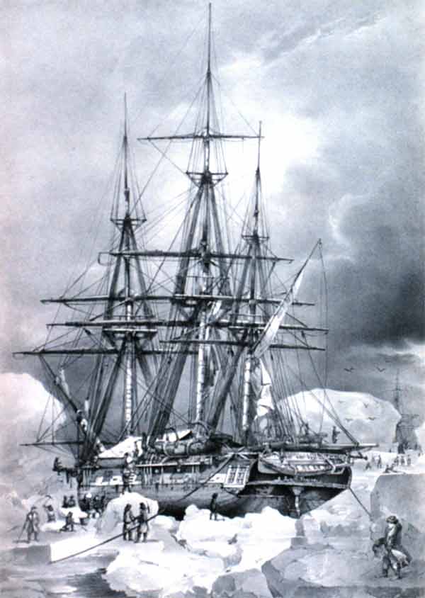 Jag vågar en gissning. Kan det vara James Cook och hans fartyg Resolution. Åtmindstone på hans andra resa var han uppe i isbältet mot Antarktis. Något som han var ensam om av den tidens upptäcktsresande. Men det kan ju också vara i Arktis och där var det ju lite mer trafikerat. Tyvärr måste jag erkänna att jag aldrig träffat karln så jag känner inte igenom honom från bilden. Har inte heller lyckats googla fram någon bra målning. Inte heller begriper jag så mycket om gamla segelfartyg men googling på Resolution visar ett fartyg som nog inte är helt olika det du visar. Åtmindstone bör det vara någorlunda samtida.