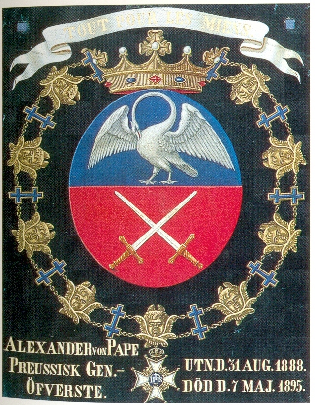 Vapnet för generalöverste Alexander August Wilhelm von Pape (1813-1895), chef för gardesarmékåren 1884-1888, guvernör i Berlin 1888-1895. Han förlänades Serafimerorden i samband med Oscar II:s besök i Berlin.