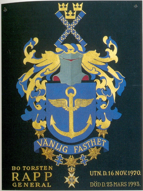 Torsten Rapp ÖB 1961-1970. Han var den siste ÖB att erhålla Serafimerorden, som enligt ändrigen av ordensväsendet 1973 slutade att utdelas till Svenska medborgare utanför kungahuset. det bevingade ankaret syftar på att General Rapp började sin karriär som flygare i marinen.