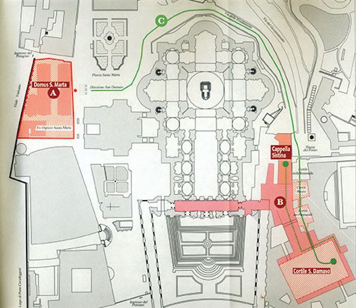 A) Domus St. Marthae; (B) Apostoliska palats; (C) kardinalernas promenad till Sixtinska kapellet.