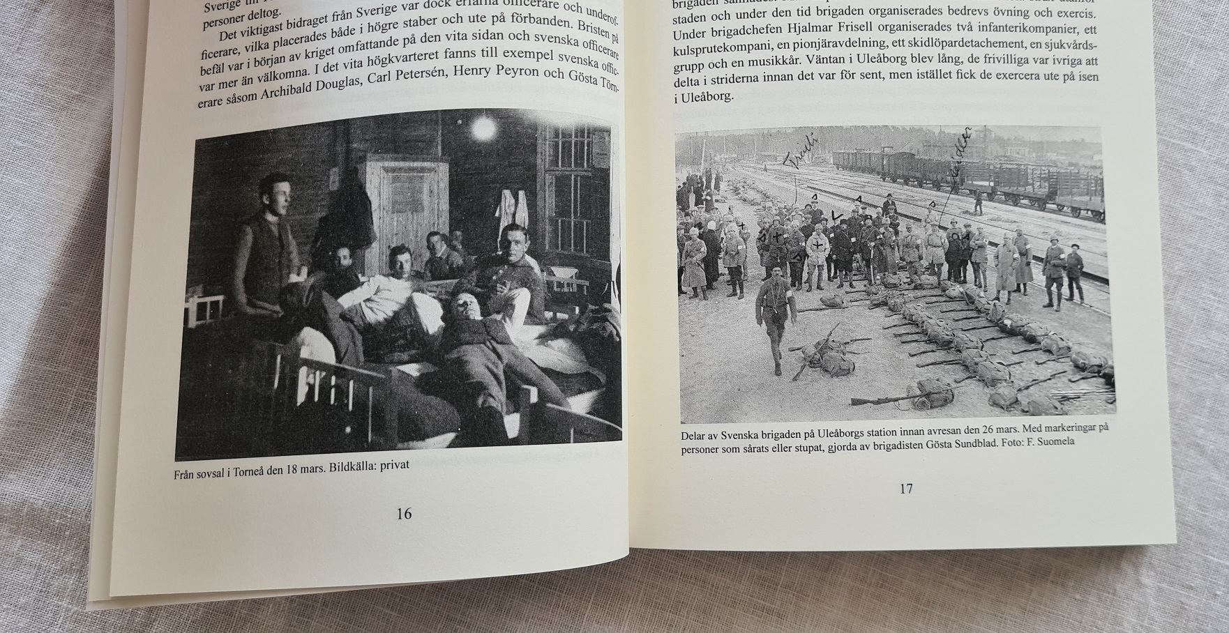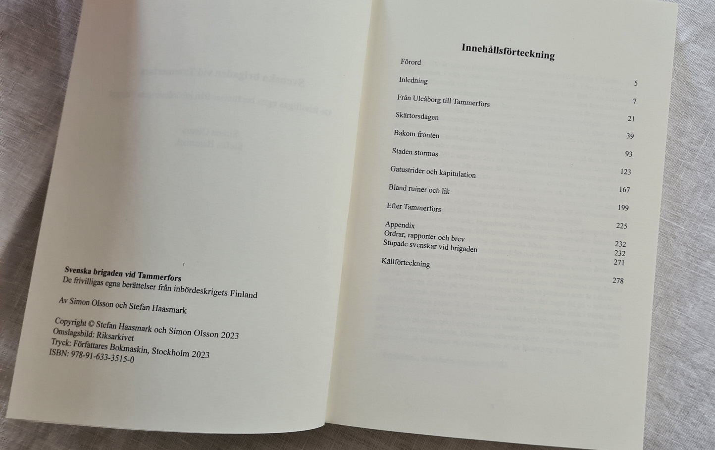 Boken beskriver Svenska brigadens tid från uppstarten i Uleåborg och fram till att Tammerfors erövrats. Informationen kommer från enskilda berättelser, brev hem till Sverige och utdrag från dåtida böcker. Texterna är hopvävda i kronologisk ordning med kommentarer från oss däremellan för att hålla ihop kontexten. Ibland skriver olika personer om samma händelse, utifrån deras synvinkel och uppfattning, vilket tillsammans ger en helhet som berättelserna var för sig saknar. Vi har jobbat mycket med att tolka det bildmaterial som finns i arkiven, för att få reda på var bilderna togs och vilka personer som är i dem.