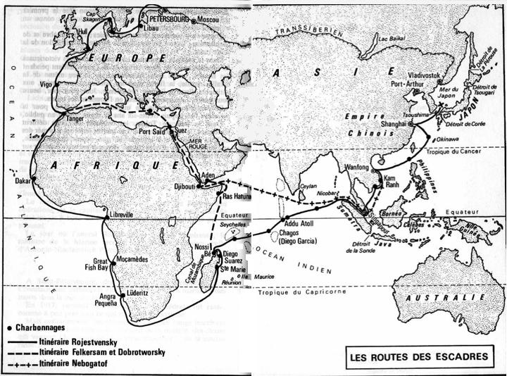 Då Rozhstvensky's eskader från och med nu - anlöper mer eller mindre, för läsaren okända platser - här en rutt-karta: