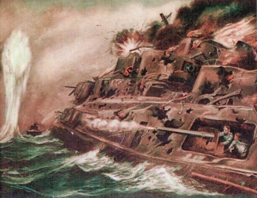 Strax efter klockan 16.oo rapporterade en brittisk observatör på kryssaren IDZUMA att SUVOROV liknade en ’’vulkanö under eruption...