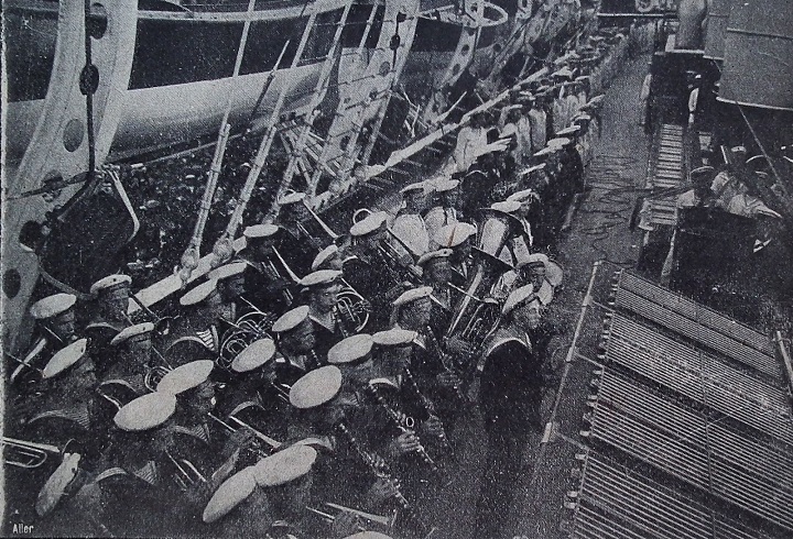 och ångar runt alla skeppen. Alla orkestrarna spelar hela tiden, skeppen flaggar över top