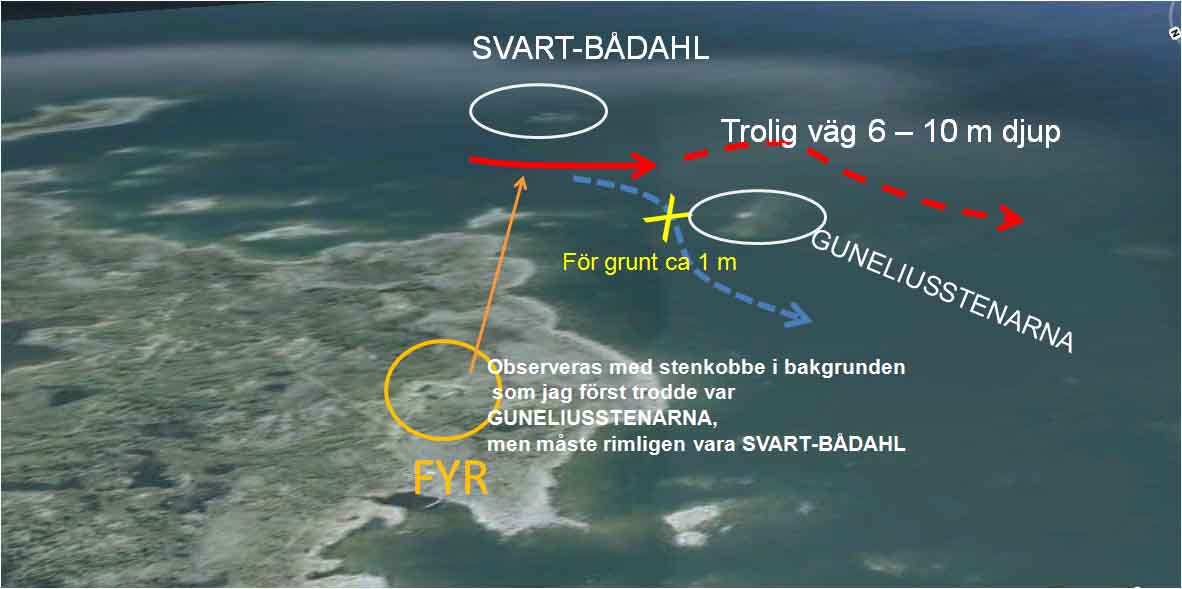 Däremot upptäcker jag i mina sjökortsstudier att omedelbart utanför det som kallas GUNELIUSSTENARNA är djupet mellan 6 - 10m. Fullt tillräckligt för en "projekt 865" / Phiranya / LOSOS ( kärt barn har många namn ... ) Och ytterliggare lite längre ut ligger SVART-BÅDAHL en annan av dessa oräkneliga stenkobbar. Detta gör att min minnesbild ändå stämmer. Men ubåten gick på utsidan av GUNELIUSSTENARNA där djupet är tillräckligt och bakom ubåten från vår utgångspunkt vid fyren syntes stenkobben SVART-BÅDAHL. Och då stämmer också det uppskattade avstådet på upp till 1000 m.