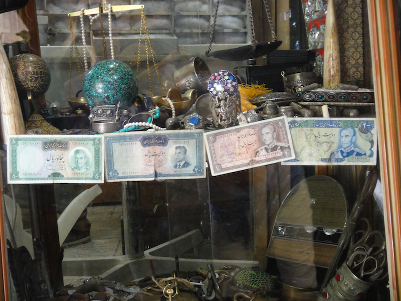 För övrigt, Shahpengar är inte tillåtna..."In 1979, after the Islamic revolution, Iranian banknotes featuring the Shah's face were counter-stamped with intricate designs to cover the Shah's face." Men som med så många andra motsägelser i detta motsägelsefulla land kunde man köpa dem i Foreign Exchange kontor eller som här hos en ädelskrothandlare...