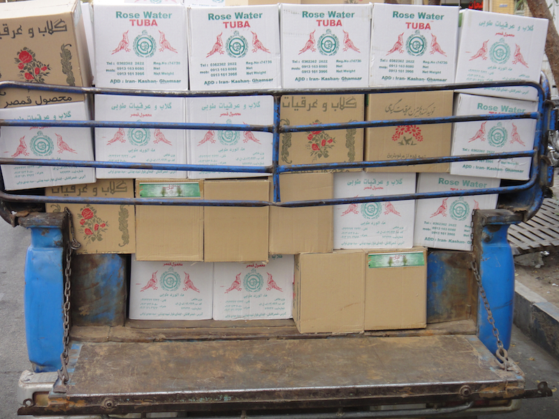 Men, icke sa' Nicke, i den apparaten destilleras framför allt rosenvatten, en vätska eller olja som har använts sedan över tvåtusen år i Iran, bl.a. i murbruk för att byggnaden ska dofta gott när solen ligger på...