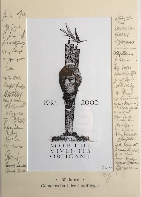 Till 50-årsjubileet ville man göra något speciellt - 50 affischer trycktes med valspråket "Mortui viventes obligant" (De döda förpliktar de levande) och 50 jaktflygare (det blev till slut 51 om jag räknat rätt) inbjöds att sätta sina autografer på affischen. Även om plakaten framför allt var tänkta för tyska Luftwaffes medlemmar - för ett ganska högt styckpris, pengar som gick direkt in i en flygarfond - så fick jag på ett tidigt stadium nys om saken och lyckades till min egen stora överraskning få tag på en!