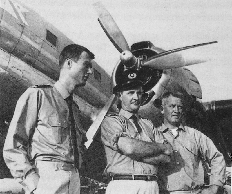 Per Bergsland fortsatte med flygandet efter kriget, först som Chefpilot hos norska Fred Olsens Flyselskap, här i mitten framför en Curtiss C-46 Commando...