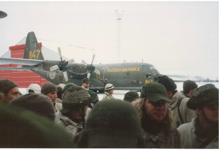 Vi steg på bussarna vid järnvägsstationen, iklädda civila kläder. När vi anlände efter en halvtimmes bussresa till mobförrådet var det urstigning. I förrådet fanns ALLT! Vi tilldelades utrustning (av praktiska skäl vår egen personliga som vi på förhand lämnat i svarta säckar med namn/nummer på). Där fanns granatkastare, motorcyklar, kokvagn, fältbageri osv osv. Det vi INTE tog med oss var tyngre vapen (av säkerhetsskäl på förhand lastat i bandvagnarna hemma på regementet: ksp58, P-skott markeringsvapen, närlys, AM-kollin till GRK etc). Efter omklädning och civil stass tillbaka i påsen blev det in i bussen och till F4 där vi ilastade Hercules fvb Gällivare. Allt klaffade perfekt. All personlig utrustning bockades av. Fältpostbrev utdelades.