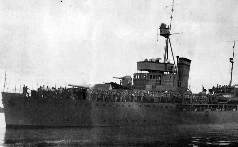Ser ut som en brittisk H-klass jagare...? Inte för att det hjälper särskilt. Men tyska(?) flygande artillerister(?) då borde vi vara nånstans i första halvan av kriget och någon tysk våghalsig offensiv. Fast dom ser rätt civila ut, vad är det för mössor egentligen? Men eftersom varjag paxat Spanien chansar jag på Rotterdam 1940? Frågetecknen är många!