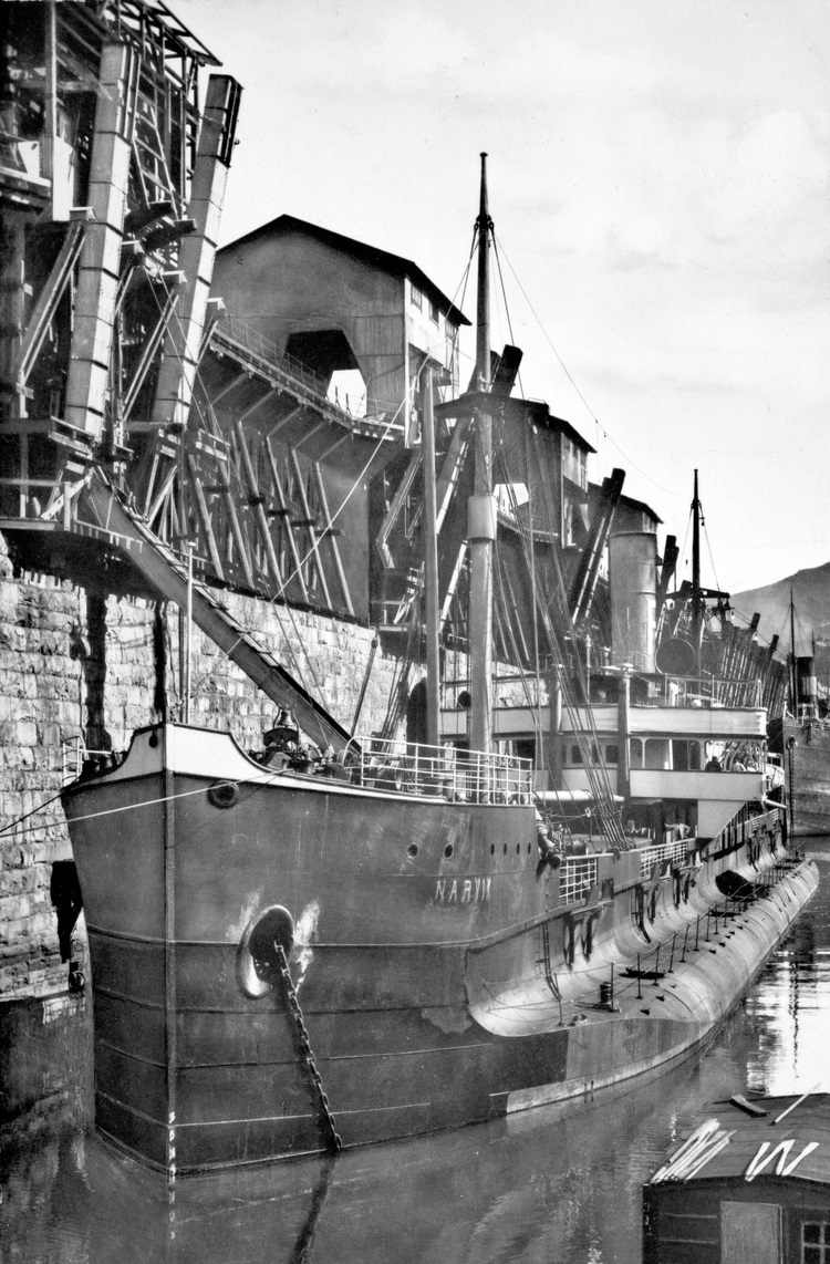Båten i bilden ser jävla mysko ut, med en egen extra brygga vid sidan av. Men det är antagligen något slags synvilla; antingen har båten krånglat sig in i en specialkanal, eller också är det något slags pontonbrygga. Eftersom Narvik inte var någon specialbyggd hybrid, det var en helt normal havsgående lastångare.