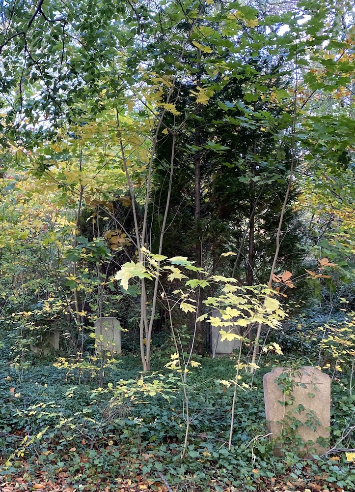 Där jag börjar mitt vandrande och sökande efter Otto Brauns gravplats, i norra ändan, där skräpskogen har fått fritt fram och gravvården står långt ner på väntelistan. Därtill kom i går stormen som drog igenom Berlin, avbrutna kvistar och grenar, lövhögar, sikt minimal, försikt maximal - man får passa upp var man placerar fötterna. Lite förlorade skymtar gravstenarna fram i buskaget. Hur ska man här hitta något?