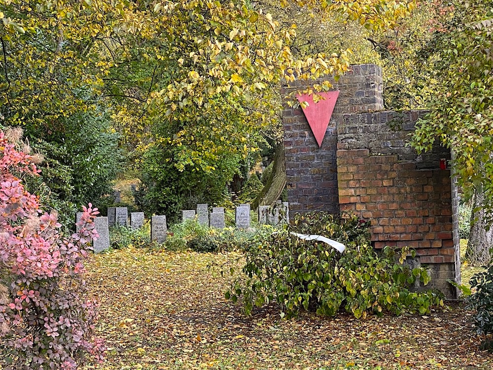 Ja, ju längre "söderut" jag vandrar desto mer välvårdad blir kyrkogården. Och det dyker upp ett par speciella gravområden, som det här, gravar för fascismens offer, de politiska fångarna med sin röda triangel...