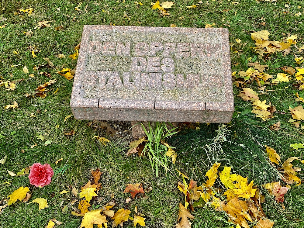 "För stalinismens offer". Inte helt självklar i den här omgivningen, och det fordrades en hel del kamp(!) innan den blev uppställd 2006! Utan protestgraffiti lördagen jag var där...