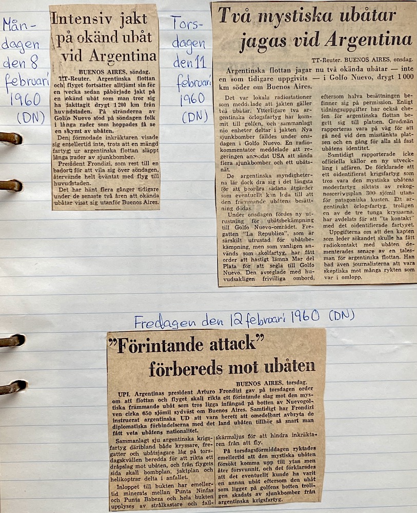 Det där med "Hitlers flykt till Argentinien" påminde mig om ett par tidningsnyheter som den unge sveahk klippte ut 1960. Det började den 8 september med att man tydligen hade upptäckt en ubåt i "Golfo Nuevo, drygt 1000 km söder om Buenos Aires". Okänd nationalitet. På den tiden tvekade man inte länge utan det argentinska flyget pepprade området med sjunkbomber. Det pågick under en hel vecka utan att något hände. Och, oh ja, det mediala intresset var naturligtvis stort och spekulationer legio. Vem och vad?