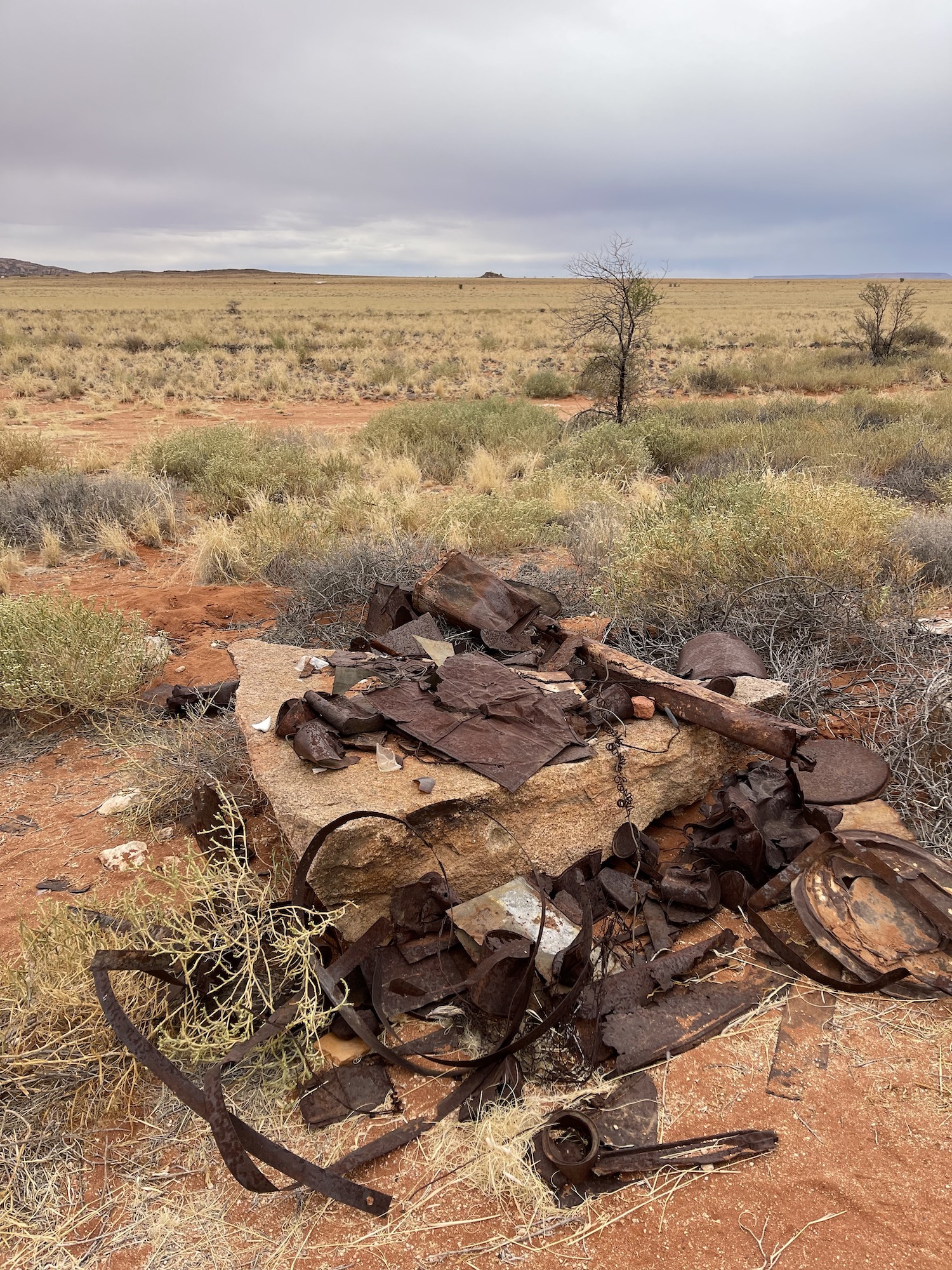 Mycket är inte kvar av byggnaderna, ett par stenar - men det som har överlevt över hundra år i det torra klimatet (Det snöade senast 1963!) är plåtskrotet!