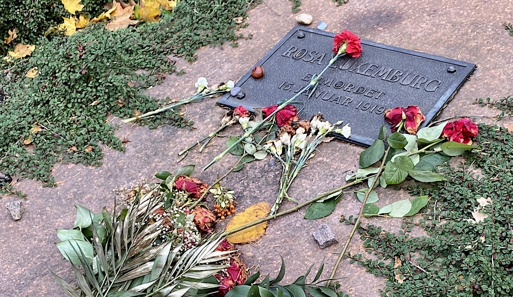 Och där har vi prunkstycket, vid huvudingången - "Gedenkstätte der Sozialisten". Muromgärdad rondell, i mitten en stor sten. Wilhelm Pieck, DDR presidenten, och bara han, bestämde 1950 hur monumentet skulle se ut. På murväggen namnen på de som räknades som antifascistiska offer, Weimar-Republiken, Hitlerregimen, spanska inbördeskriget. Viktigt var det med det "antifascistiska" i det politiska DDR, en känga mot 50-talets BRD...?