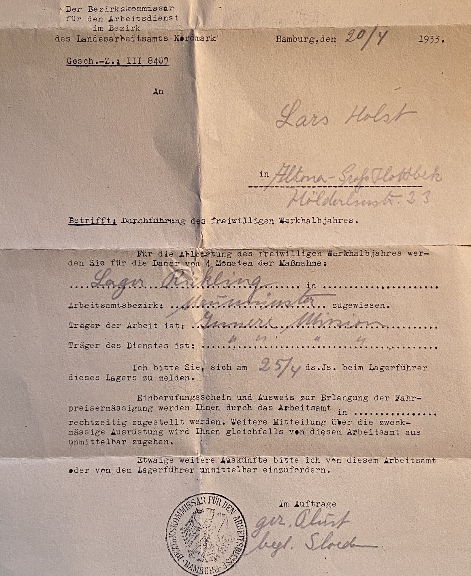 Lars Holst bor fortfarande i Altona-Großflottbek. Den 20 april 1933 får han ett officiellt brev...