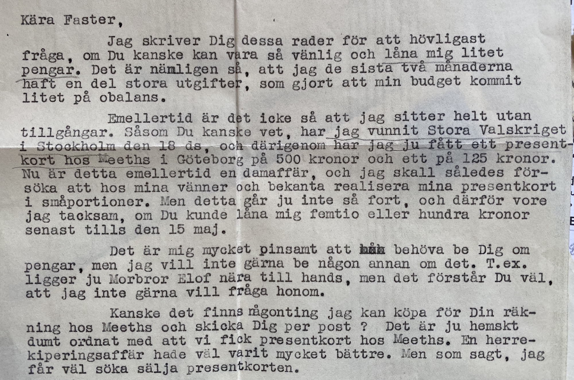I det brevet får vi också veta att Lars är dansant! Han har i mars 1939 vunnit Stora Valskriget i Stockholm (jo, det står så!)...