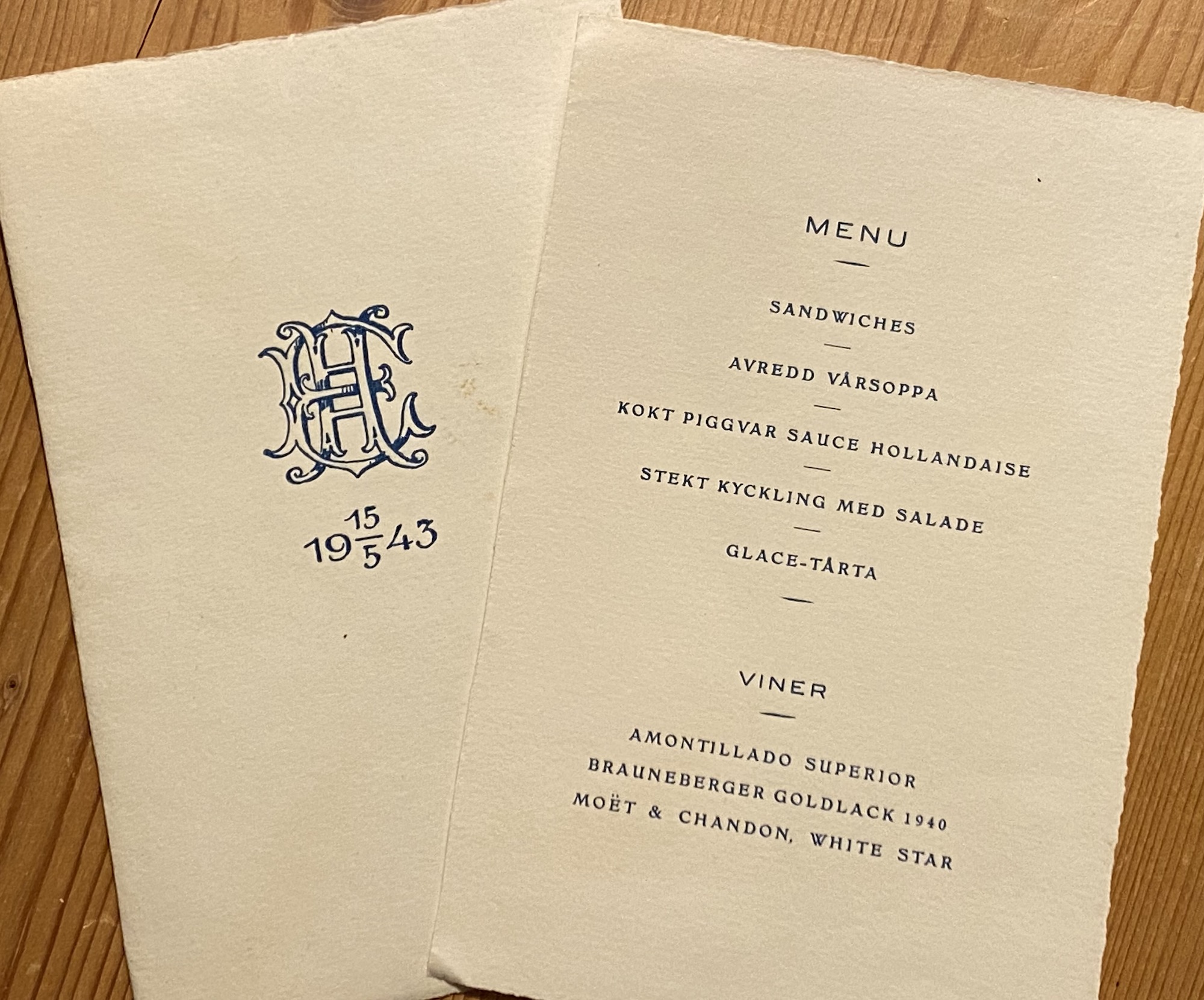 I ett annars tomt kuvert hittade jag den här slå-klackarna-i-taket inbjudan från Lars boss, våren 1943 - meny och bordsvisa inbegripen