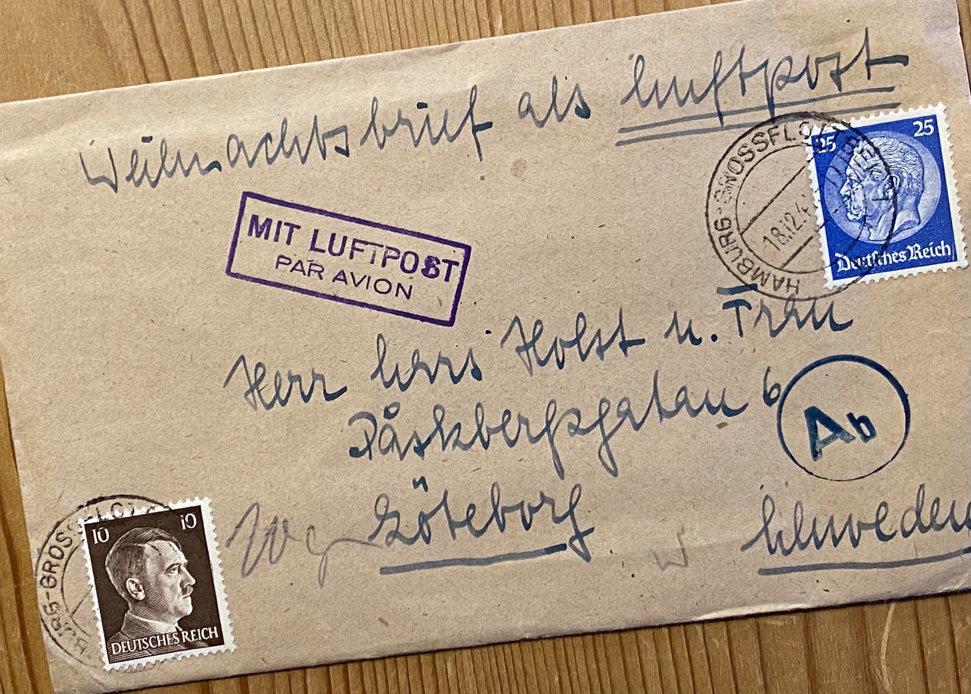 Breven från Tyskland till Sverige 1943 var ordentligt kontrollerade - stämplar, censurremsor och ofta också kontrollerade för ev. osynlig skrift...kunde se ut så här...