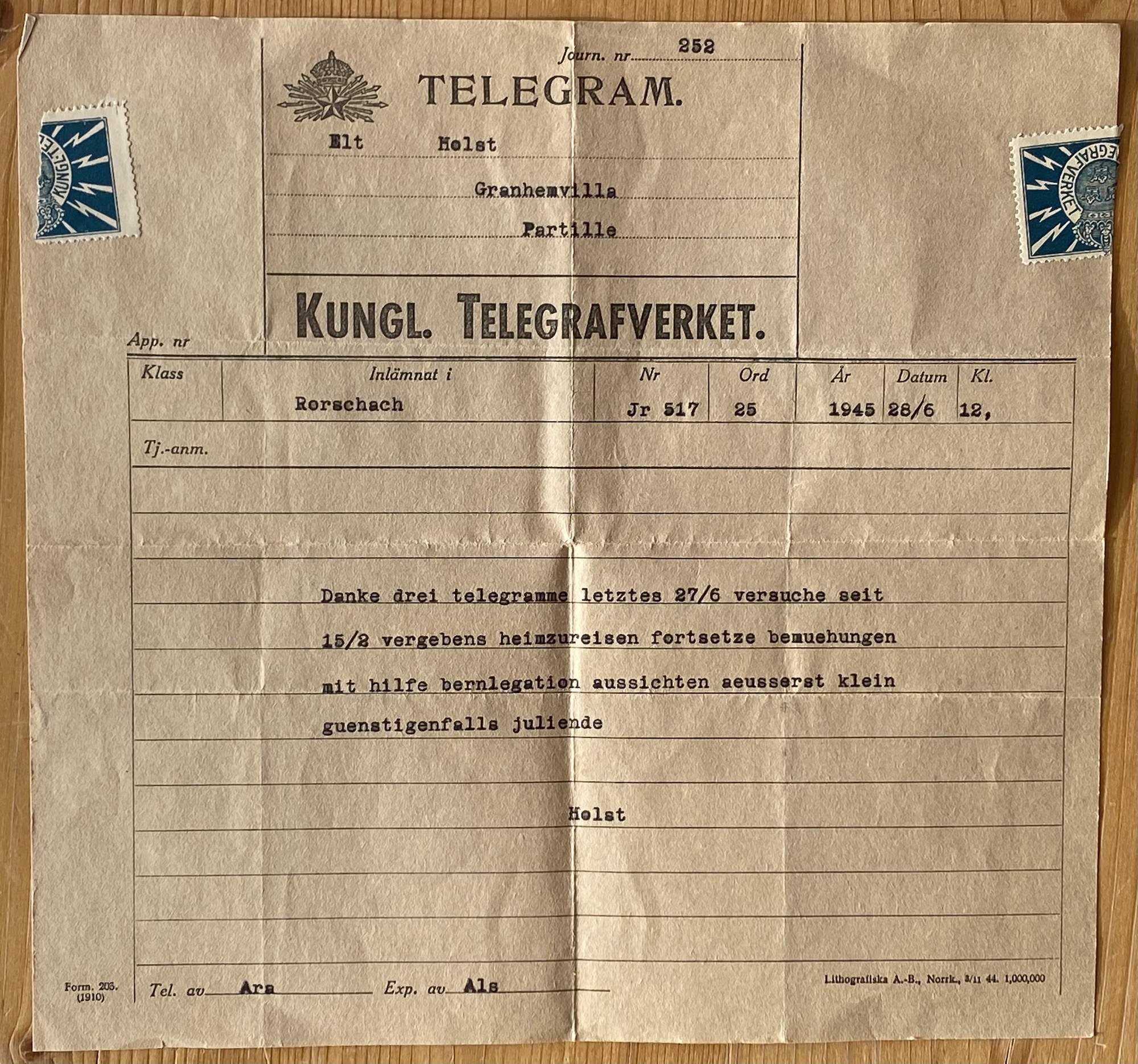 "Tack för tre telegram, den senaste 27/6. Försöker sedan 15/2 förgäves att resa hem. Fortsätter försöken med hjälp av Bernlegation. Utsikter ytterst små. I bästa fall slutet av juni. Holst"