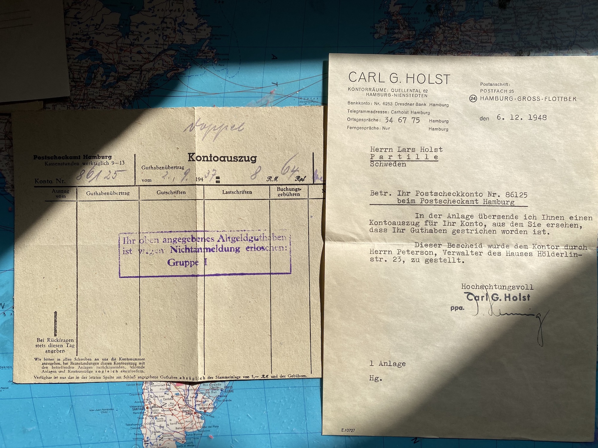 Nästan samtidigt med julkortet kom också ett kontoutdrag till Lars från Postcheckamt Hamburg. Ett tillgodohavande på 8 RM 64 Pf är struket på grund av "icke anmälan". I kuvertet också ett brev till "Herrn" Lars Holst från Carl G Holst - högaktningsfullt. Ett affärsbrev för myndigheterna antar jag...därför den formella tonen...!?