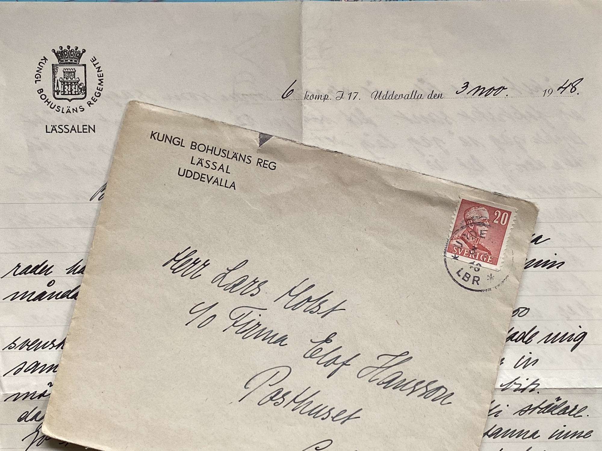 Ett kompisbrev till Lars Holst från 938 Bergström (förnamn Ove?), som skriver från Läsesalen på Kungl. Bohusläns Regementes officiella papper november 1948. Innehållet, tja, något virrigt, bl.a. hur han lyckas smita från tjänsten genom simulerad sjukdom...det regnar ju...!
