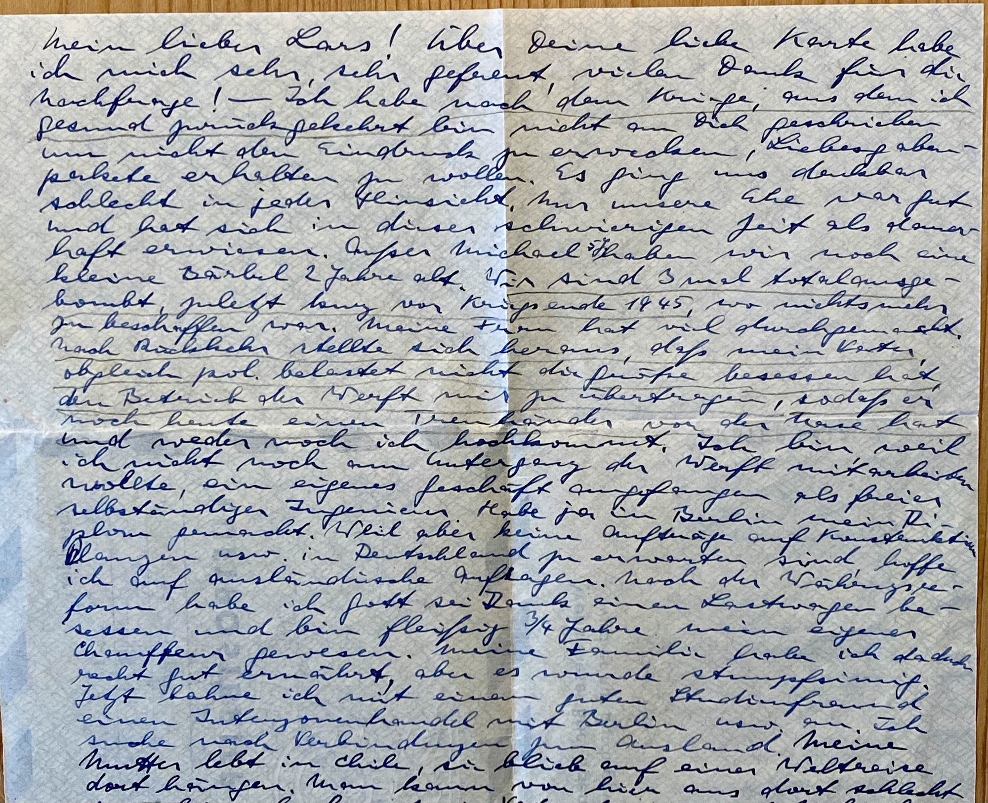 Ich habe nach dem Kriege; aus dem ich gesund zurückgekehrt bin nicht an dich geschrieben, um nicht den Eindruck zu erwecken, Liebesgabenpakete erhalten zu wollen. Es ging uns denkbar schlecht in jeder Hinsicht, nur unsere Ehe war gut und hat sich in dieser schwierigen Zeit als dauerhaft erwiesen. Ausser Michael, 5 Jahre, haben wir noch eine kleine Bärbel, 2 Jahre alt. Wir sind dreimal total ausgebombt, zuletzt kurz vor Kriegsende, 1945, wo nichts mehr zu beschaffen war. Meine Frau hat viel durchgemacht. Nach Rückkehr stellte sich heraus, dass mein Vater, obgleich politisch belastet, nicht die Grösse besessen hat, den Betrieb der Werft mir zu übertragen, so dass er noch heute einen Treuhänder vor der Nase hat und weder er noch ich hoch kommt.