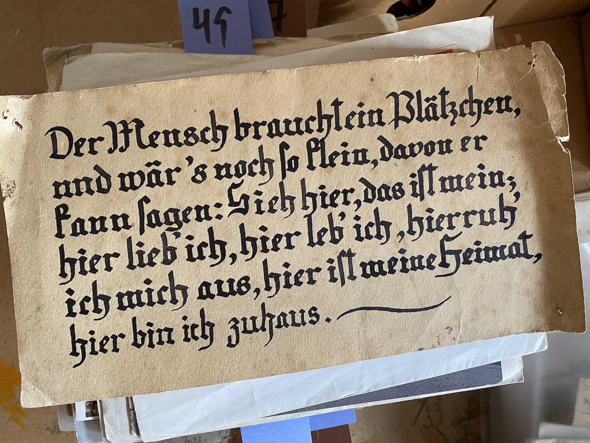 Hittade under alla breven som Markus skickade också denna fint textade pappersskylt. En rimmad hymn till hemmets härd, i gammal frakturskrift...