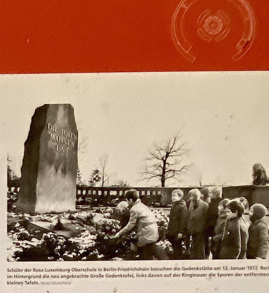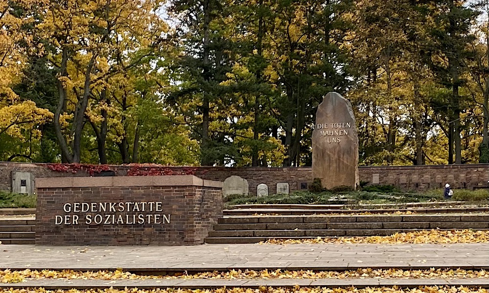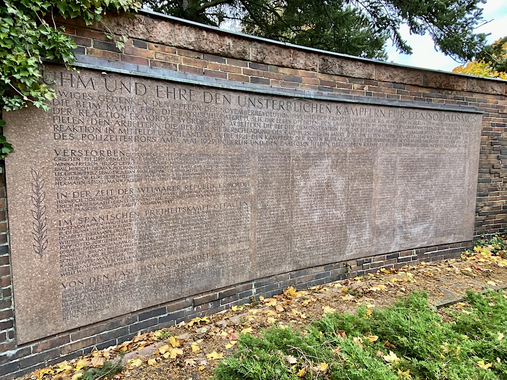 Och där har vi prunkstycket, vid huvudingången - "Gedenkstätte der Sozialisten". Muromgärdad rondell, i mitten en stor sten. Wilhelm Pieck, DDR presidenten, och bara han, bestämde 1950 hur monumentet skulle se ut. På murväggen namnen på de som räknades som antifascistiska offer, Weimar-Republiken, Hitlerregimen, spanska inbördeskriget. Viktigt var det med det "antifascistiska" i det politiska DDR, en känga mot 50-talets BRD...?