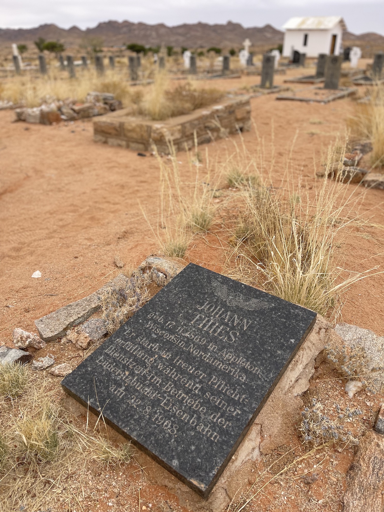 Andra tyskar, tidigare begravda, ligger där - farmare, soldater, kolonisatörer...som den här grabben, järnvägsarbetaren Johann Thies, född, i Wisconsin, USA, strax efter det amerikanska inbördeskriget 1969. Dog 1908 i Sydvästafrika.