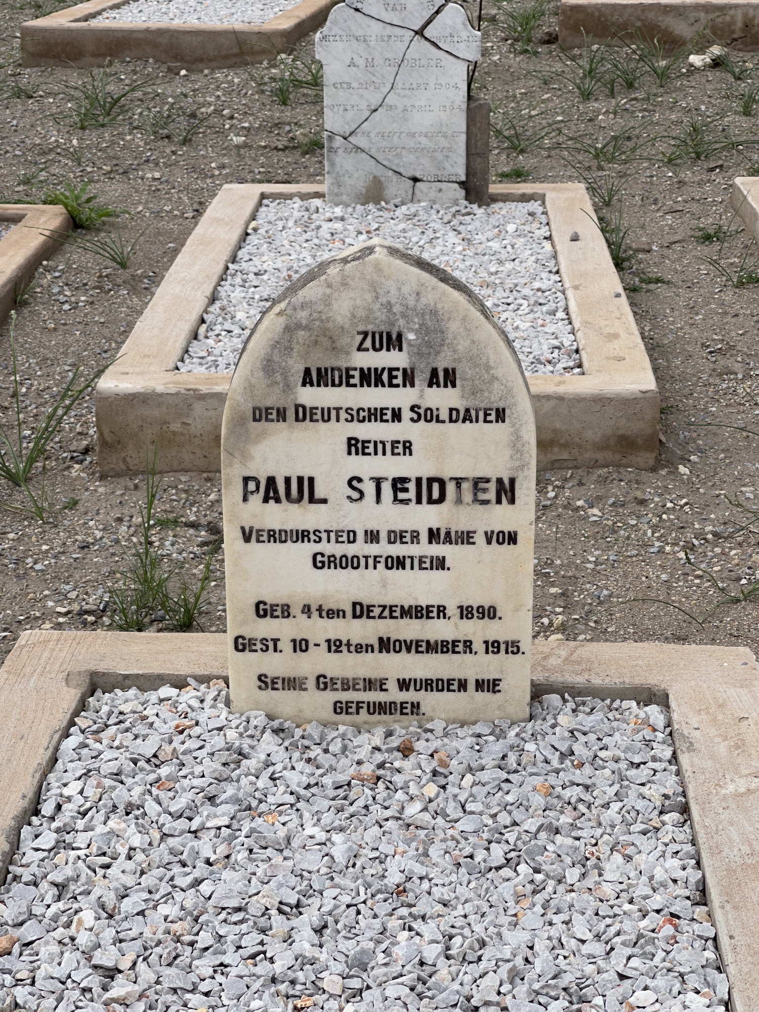 Innan jag slutar. Den tyska kavalleristen Paul Steidter törstade 1915 ihjäl . Hans gravsten står i Grootfontein - själv vilar han på okänd ort...