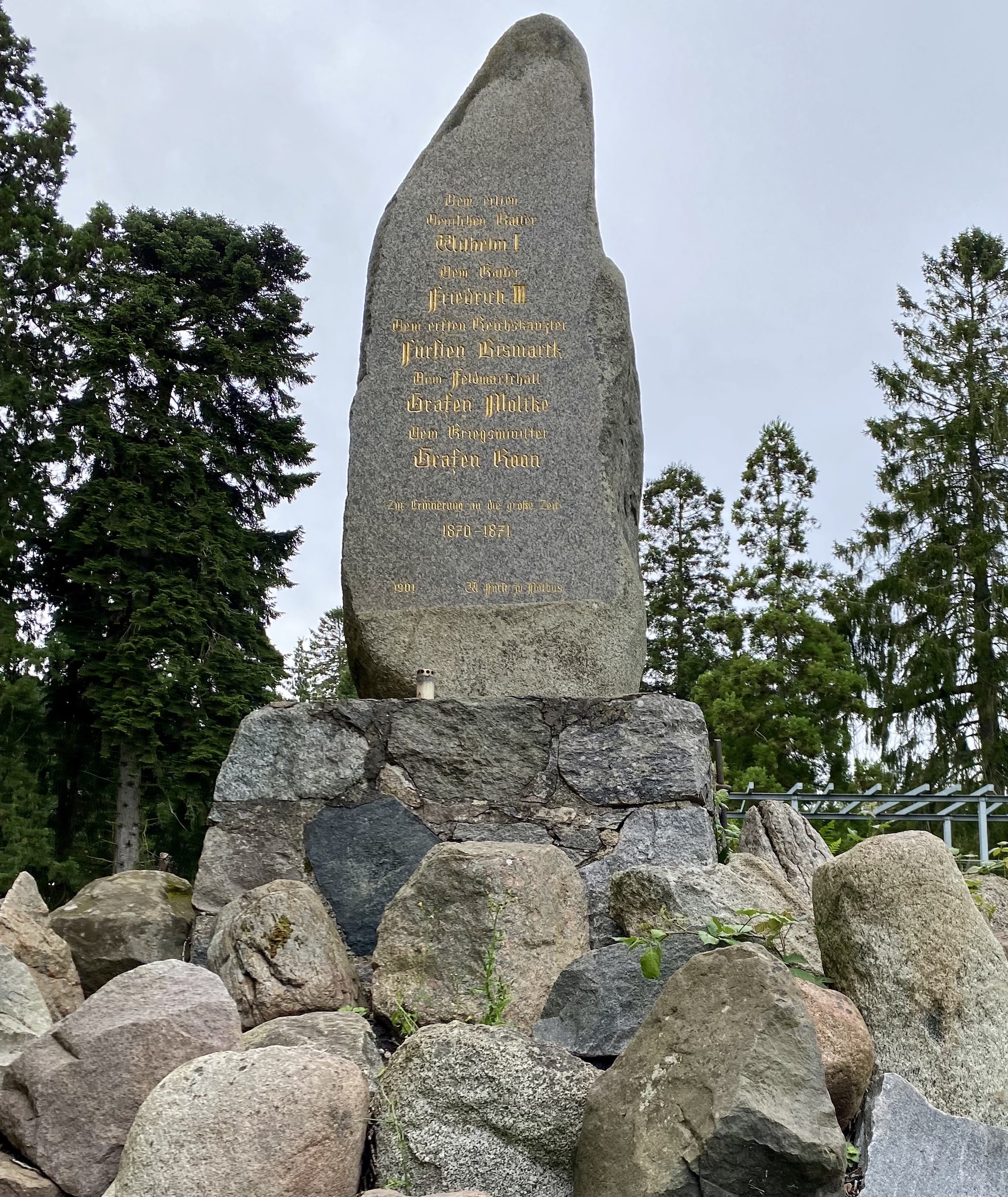 ...eller en stendös som flyttats till Putbus 1901 - väl en omöjlighet i dag, jag menar, att flytta på megalitiska gravstenar! - inmejslade är grabbarna från anno dazumal, Friedrich I, Wilhelm III, Bismarck, Moltke och Roon. För övrigt bortmejslade 1970 av DDR-regimen, och åter inmejslade efter "die Wende"...